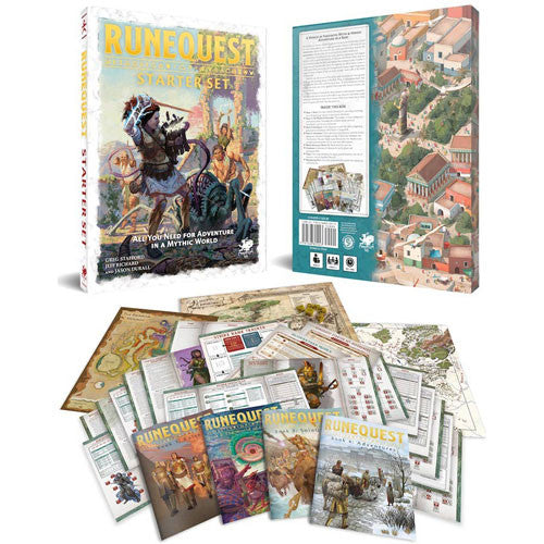 The RuneQuest Starter Set allows players to easily immerse themselves into Glorantha and its system, with ready-to-use characters and ready-to-play adventures allowing for many hours of play. There is no better wy to learn about the game and world than this starter set.