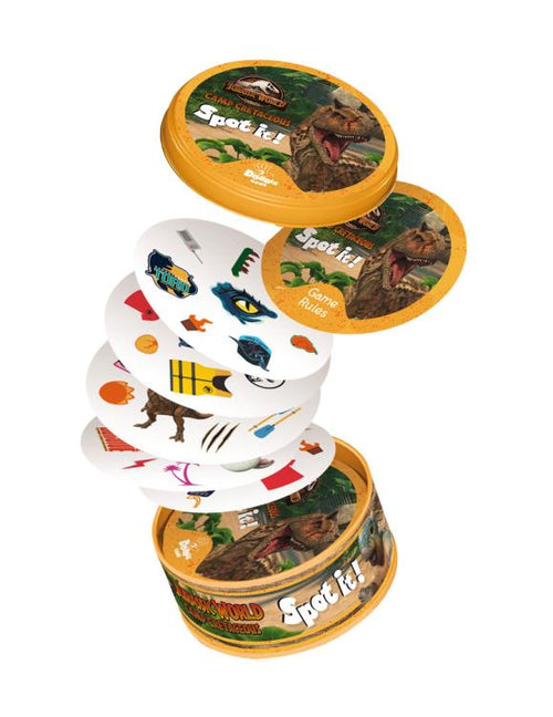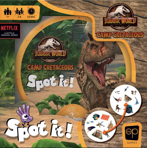 recognition game with a pop culture twist for a new way to enjoy your favorite dinosaurs! In Jurassic World Spot It!, there is only one matching character or item between any two cards. Be the first one to spot pairs of Walkie Talkies, Mr. DNA, and other symbols from the hit Netflix series to win!